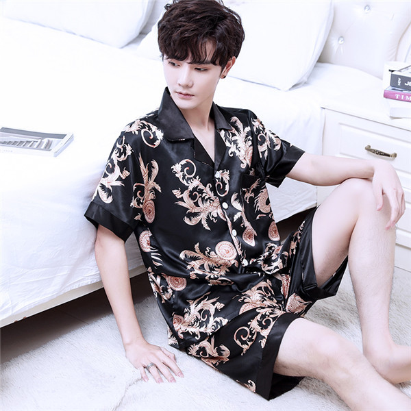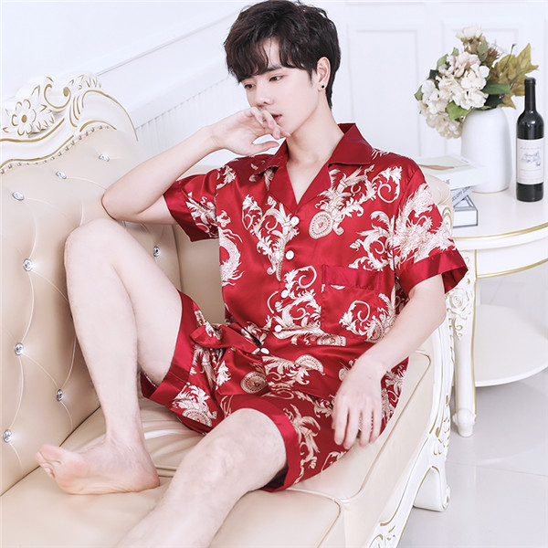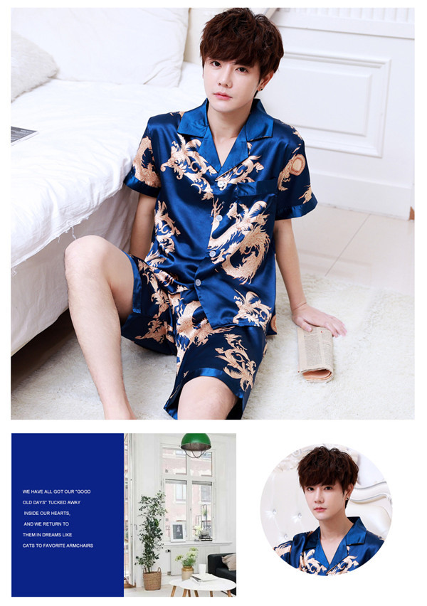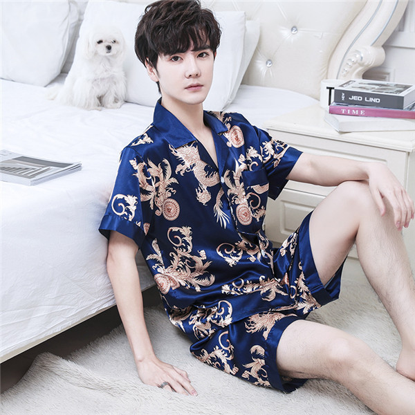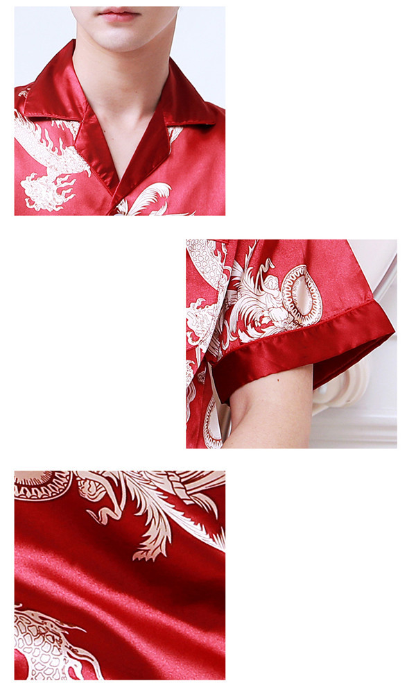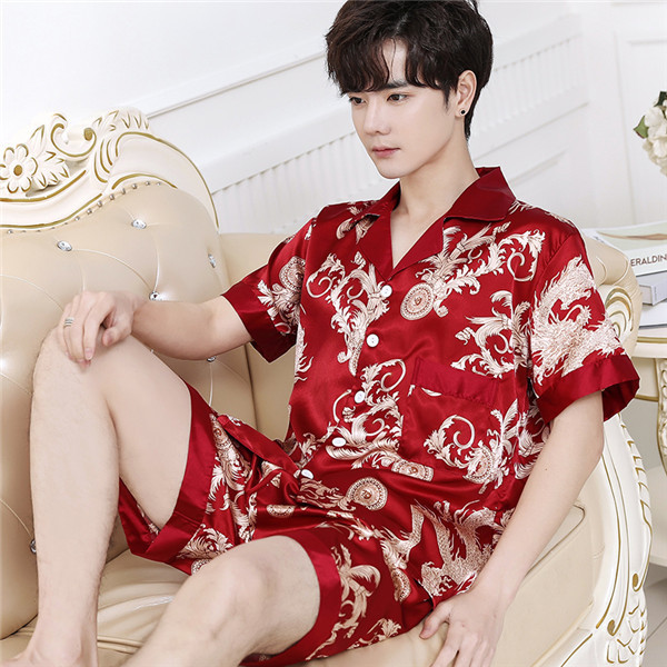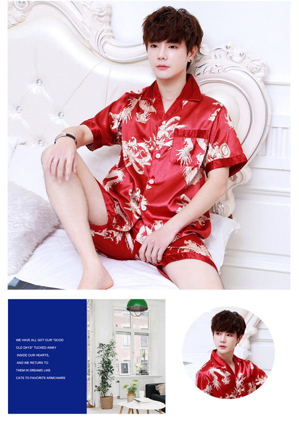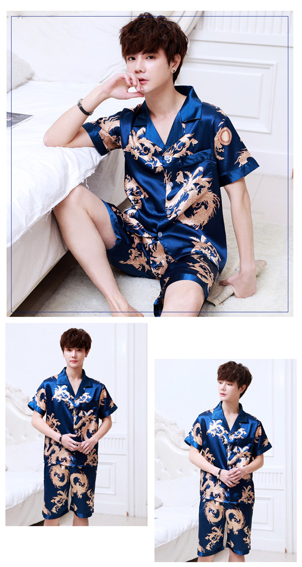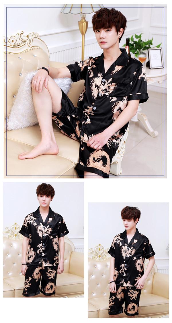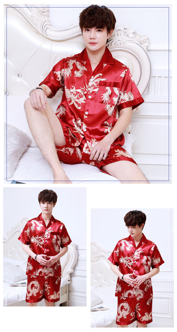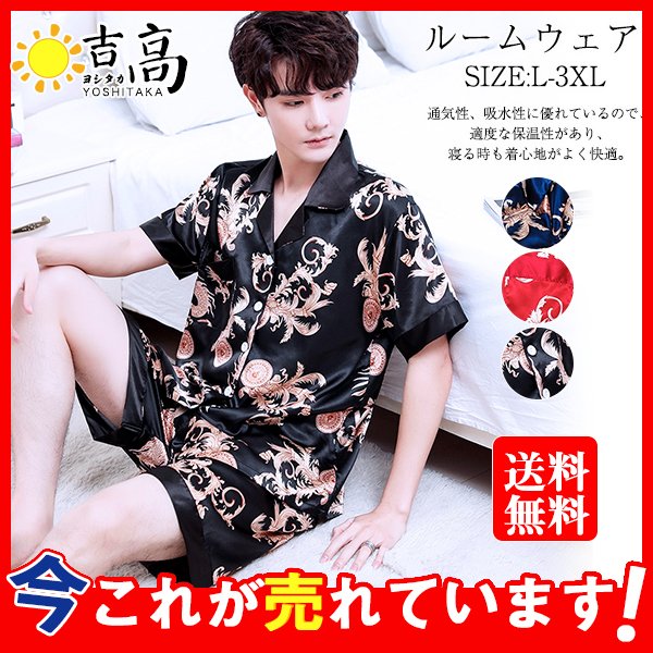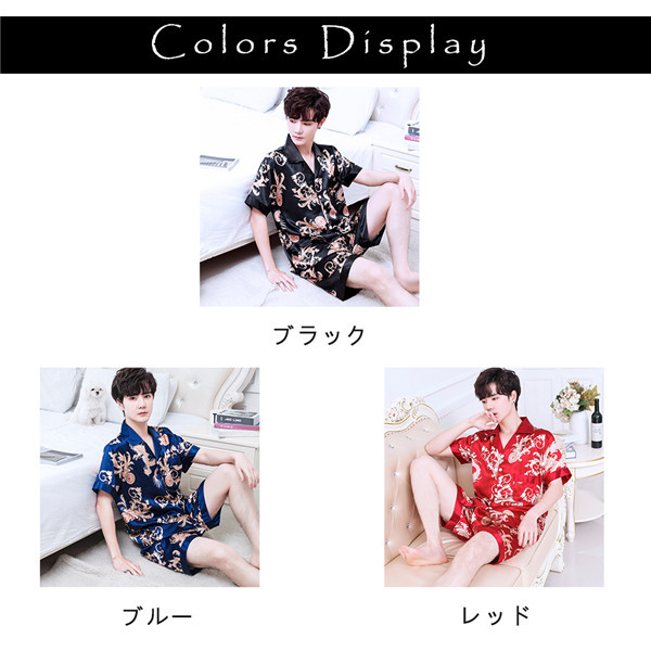 メンズ パジャマ 上下セット 龍柄 和風 シルク調サテン地 ルームウェア ショートパンツ 和柄 春 夏 半袖 シルク 短パン Tシャツ 軽い 薄手