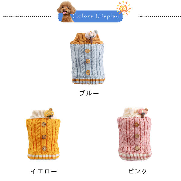 商品詳細:カラー:/ブルー/イエロー/ピンクサイズ:/XS/S/M/L/XL-------------■商品説明冬でも秋でも快適に過ごせます、アウトドア、お散歩、お出かけなどに大活躍!愛犬と楽しい時を過ごして下さいね。お友達や親族にワンちゃんを飼っている方へのプレゼントとしてもとっても喜ばれます。-------------■素材ポリエステル、その他-------------■ご注意●サイズ表記は目安です。誤差はご了承ください。●生産の関係により写真と色、柄が若干異なる場合があります。-------------■キーワード犬服 かわいい あったかセーター 犬用 冬服 シーズー パグ ヨーキー 裏起毛 もこもこ マルチーズ チワワ 安い ペット服 ドッグウェア 室内犬用 秋冬 ニット 中綿入り 犬 服 ペットウェア 小型犬 中型犬 小型犬用 トイプードル トイプー チワワ 柴犬 ポメラニアン シュナウザー ビーグル ミニチュアシュナウザー ヨークシャテリア ヨーキー かわいい犬服 安い シンプル