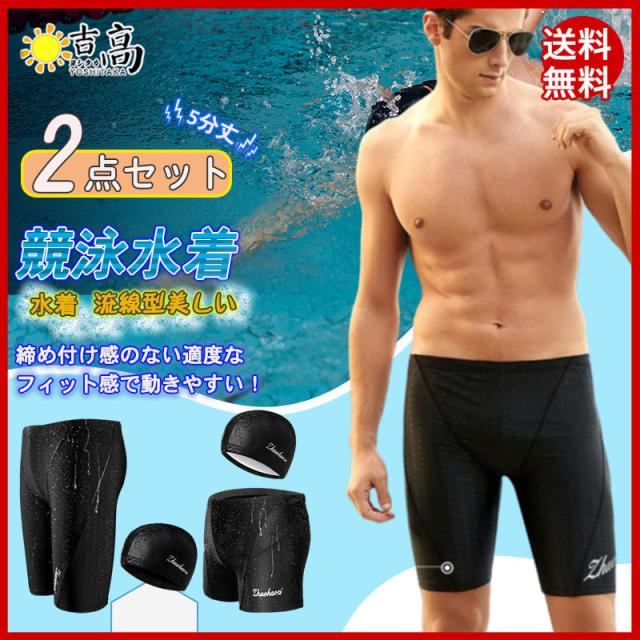 水着 メンズ 水泳 キャップ付き フィットネス水着 2点セット 競泳 スイムウェア 速乾 5分丈 短パン サーフパンツ 競泳水着 おしゃれ 温泉 海