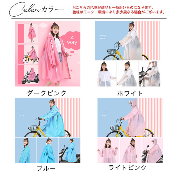 商品詳細:カラー:/ダークピンク/ホワイト/ブルー/ライトピンクサイズ:/L/XL■商品説明■通勤の会社員やサラリーマン通学の学生、主婦やママさんにおしゃれな自転車専用ポンチョです。防水・撥水効果抜群袖口にゴム付きで動きが安くなる。立体構造だから足元も濡れずにカバー2重ツバ採用で顔や斜め雨にも対応済。反射素材を使用しているので夜でも安心。■製品仕様■素材:オクスフォード■ご注意■◆ご使用後は水滴を払い落し、風通しの良いところに保管してください。◆油汚れなどが付着した場合は、中性洗剤をご使用ください。◆実物の色に近くなるよう自然光での撮影を基本にしていますが、モニター環境等により実物と若干異なる場合がございます。◆柄物プリントの柄配置は、縫製の都合上、商品毎に異なる場合がございます。■キーワード■レインコート 合羽 ポンチョ バイク レインポンチョ 自転車用 レインウェア 防水 通学 レディース メンズ レインスーツ カッパ 厚手生地