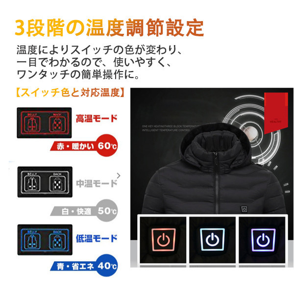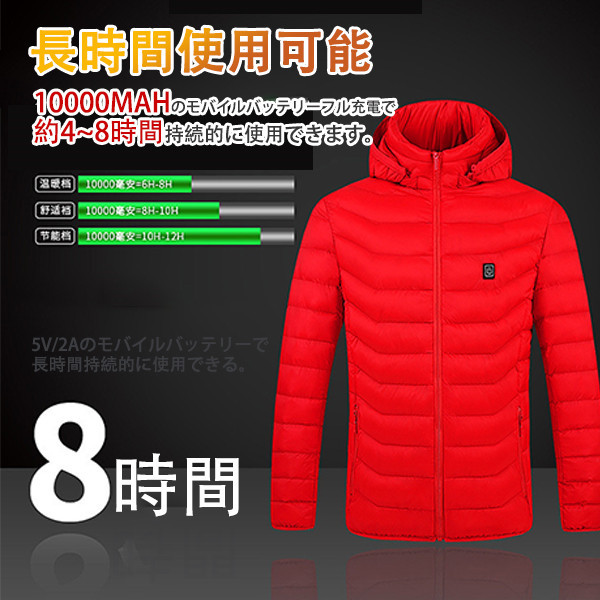 商品詳細:カラー:/レッド/ブラック/ネイビーサイズ:/S/M/L/XL/2XL/3XL/4XL【注意】モバイルバッテリーを付属しておりません。市販の2Aモバイルバッテリーで使用することができます。【商品説明】機能概要:防寒保温、痛み緩和、血液循環促進、冷え性対策、疲労軽減、リウマチ緩和など使用シーン:キャンプ、日常生活、釣り、バイク、ゴルフ、スキー、登山、屋外作業、夜勤、旅行、お出かけ、通勤、通学、オフィスなど。【使用方法】■ジャケットにあるポケットにバッテリーを入れ、ジャケットとバッテリーを配線で繋いで下さい。■電源ボタンを長押し(約3秒間)して電源を入れて下さい。その時に、赤色点滅になり、ジャケットは予熱中です。5分ほど後に、予熱完了です。スイッチのライトは白になります。■ボタンを押す度に赤(高温)、白(中温)、青(低温)へと切り替わります。■ボタン長押しで電源OFFとなります。【製品仕様】■素材:ポリエステル、その他■仕様(ヒーター):4箇所