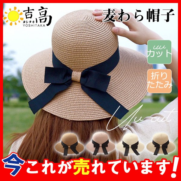 麦わら帽子 レディース リボン あご紐付き 風で飛ばない 折りたたみ 日よけ帽子 ペーパーストローハット 自転車 おしゃれ uvカット 春夏 リゾート
