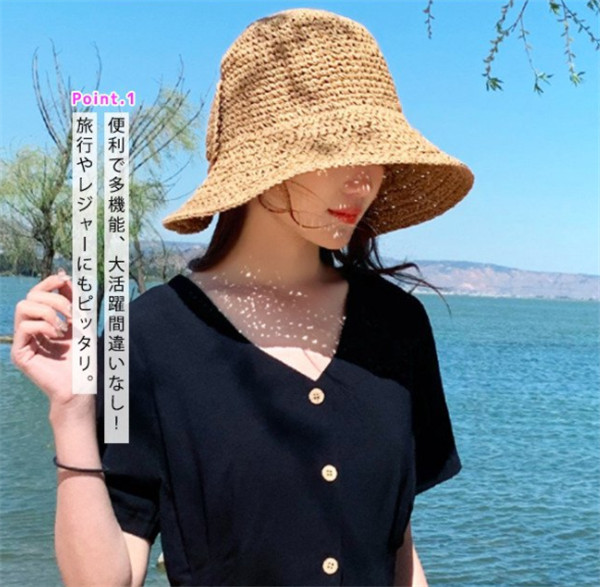 麦わら帽子 レディース ざっくり リボン スリット入り ワイヤー入り 折りたたみ 日よけ帽子 ペーパーストローハット おしゃれ uvカット 春夏