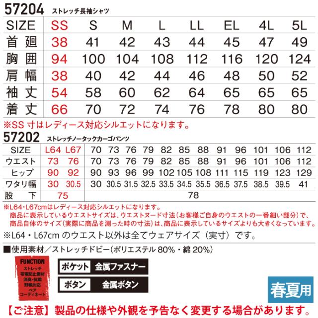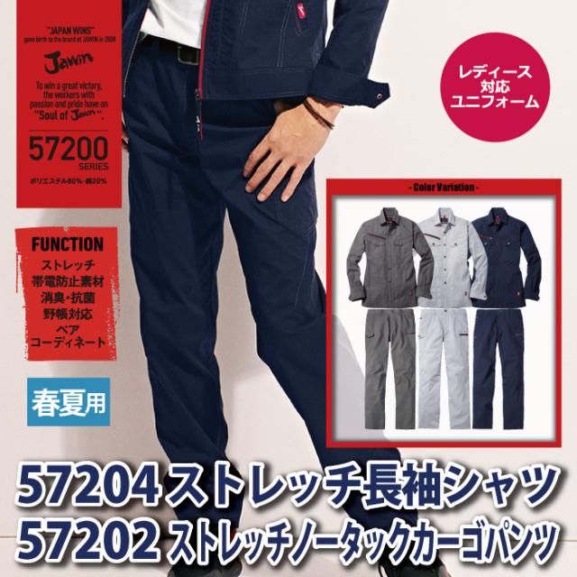 自重堂 JAWIN ジャウィン 作業服 上下セット 57204 ストレッチ長袖シャツSS-EL と 57202 ストレッチノータックカーゴパンツ L64-101 春夏用 作業着