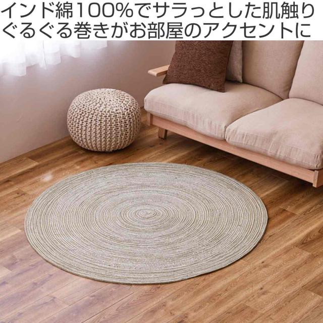 天然素材のインド綿を100%使用した円形のラグです。ぐるぐる模様の丸い形で、お部屋のアクセントにも丁度良いです。さらっとした肌触りでオールシーズンお使いいただけます。