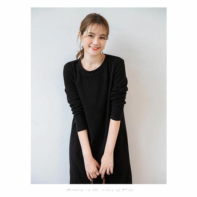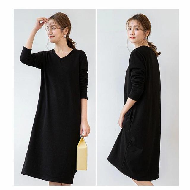 【商品名】 ワンピース 裏起毛 長袖 きれいめ 秋 冬 レディース ロング丈 ミモレ丈 クルーネック vネック スウェット あったか 暖かい 防寒 ポケット付き 部屋着 ルームウェア シンプル 無地 ゆったり 体型カバー マタニティ 黒