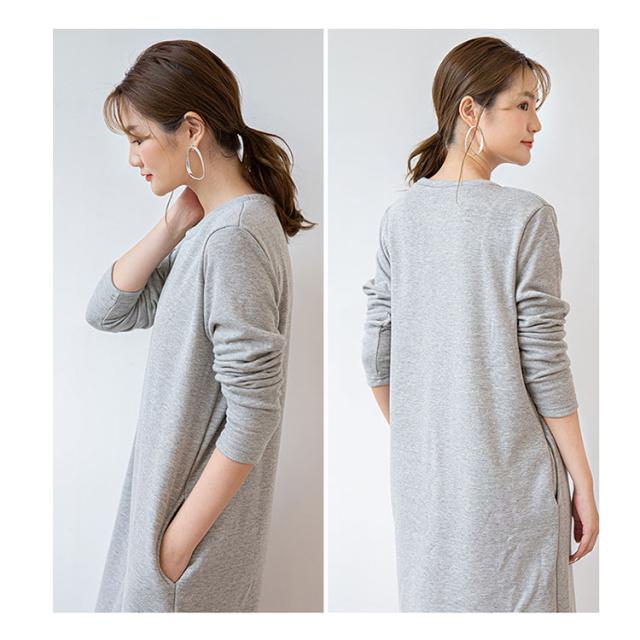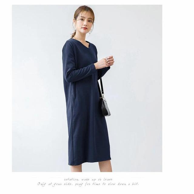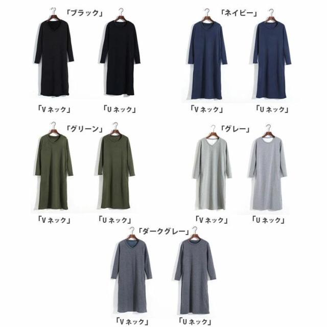 ワンピース 裏起毛 長袖 きれいめ 秋 冬 レディース ロング丈 ミモレ丈 クルーネック vネック スウェット あったか 暖かい 防寒 ポケット付き 部屋着 ルームウェア シンプル 無地 ゆったり 体型カバー マタニティ 黒 グレー グリーン ネイビー