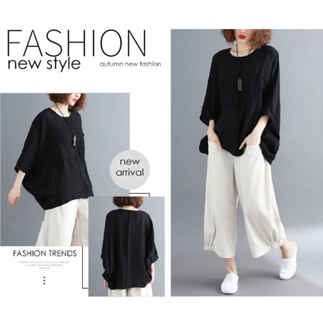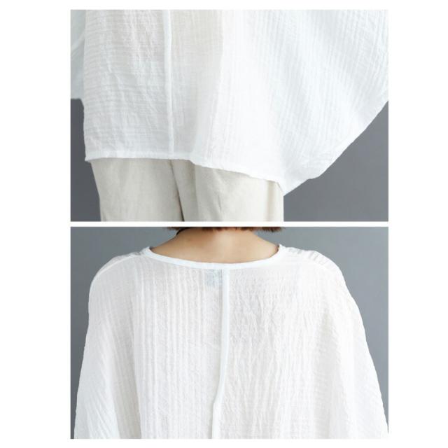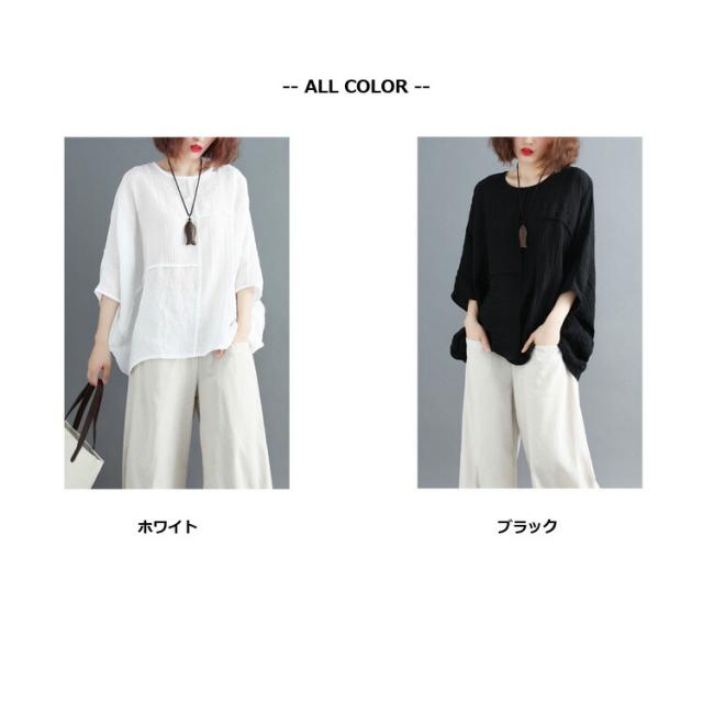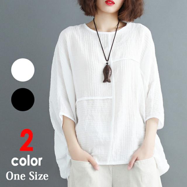ブラウス レディース 七分袖 長袖 カットソー チュニック クルーネック ドルマン プルオーバー 春 夏 秋 トップス 薄手 透け感 無地 重ね着 カジュアル ナチュラル 大きいサイズ ゆったり 大人可愛い おしゃれ かわいい 黒 ブラック 白 ホワイト