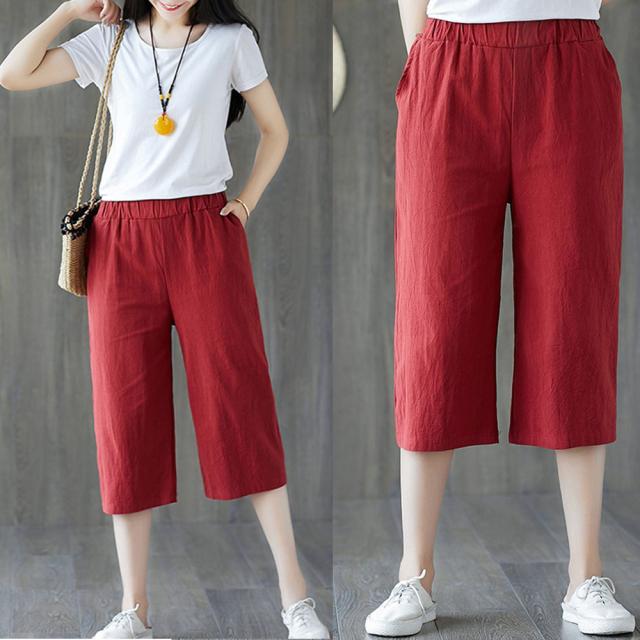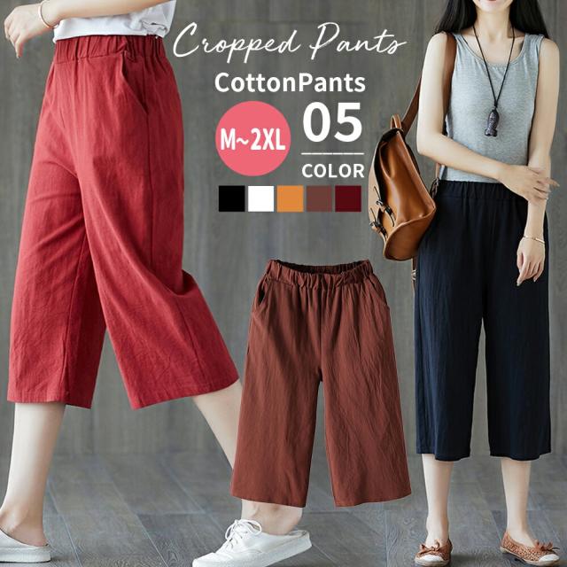ワイドパンツ レディース 七分丈 パンツ 春 夏 楊柳 リラックスパンツ イージーパンツ クロップドパンツ ボトムス ルームパンツ コットン ウエストゴム 薄手 大きいサイズ おしゃれ 可愛い ゆったり 涼しい シンプル 無地 楽ちん 黒 白 赤 ブラウン