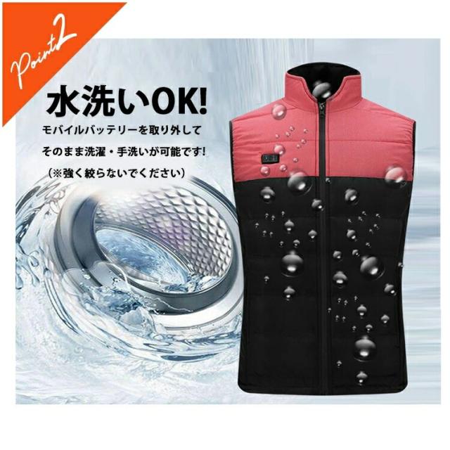 *バッテリーをポケットに入れて、USB接続ケーブルを差し込むだけで、加熱することができます。*洗濯機で丸洗いも出来ます。ご注意:洗濯機で洗う場合は損傷を防ぐ為に、USBケーブルをポケットの中に収納して下さい。[関連ワード]ダウンベスト 加熱ベスト ヒーターベスト 秋冬 男性用 女性用 チョッキ 加熱服 ヒーター 発熱 前後独立温度設定可能 ユニセックス ポカポカ 釣り プレゼント あったかベスト カジュアル 冷え対策 防寒着 キャンプ スキー スノボ 暖房ベスト 大きいサイズ