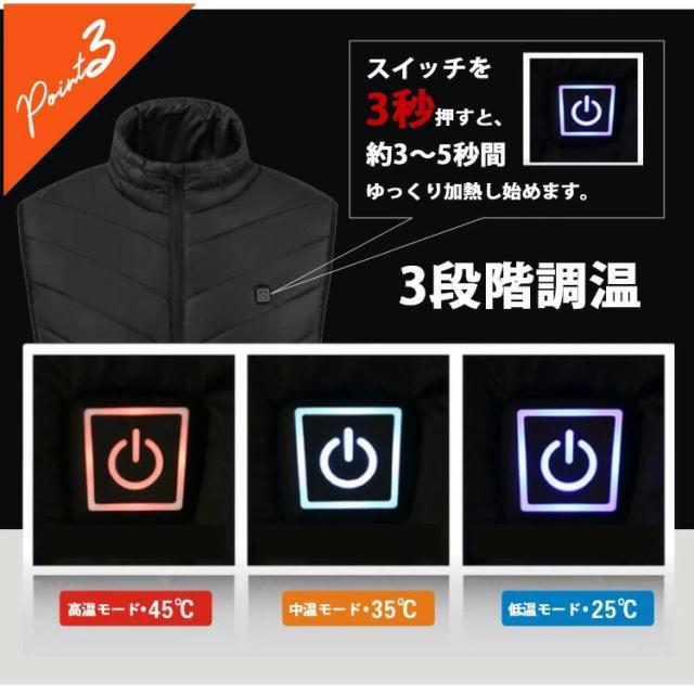 | 【商品名】 加熱ベスト 加熱服 USB充電式 電熱ベスト ヒートベスト ヒーター内蔵 ヒーター ベスト アウター モバイルバッテリー 加熱 防寒対策 メンズ3段階温度調整 保温 防寒 軽量 水洗い可能 |