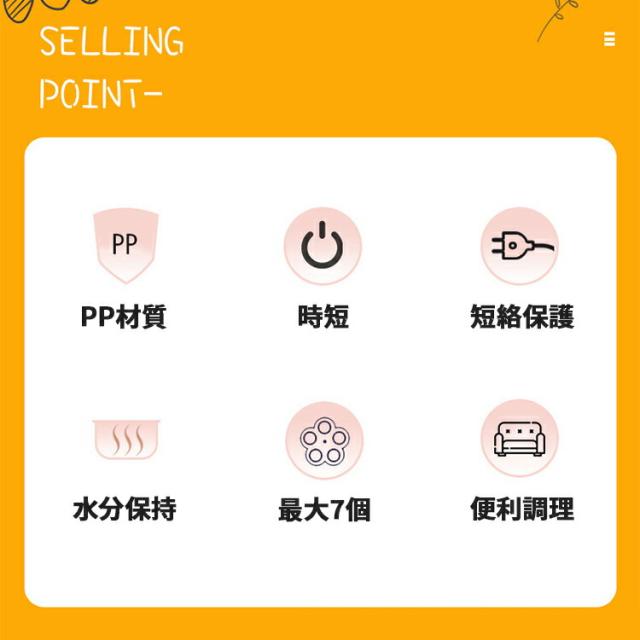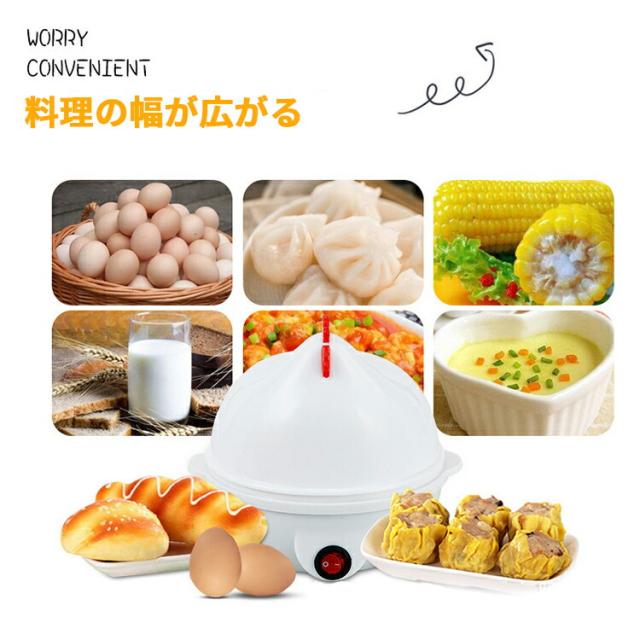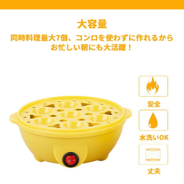 | 【製品について】 【同時料理最大7個】 電気ゆで卵器。最大7個まで茹でられます。また、タイマー式で水の量と時間を調節して、固ゆで/半熟お好みの美味しいゆで卵が簡単にすぐ作れます。コンロを使わずに作れるからお忙しい朝にも大活躍! 【大容量】 家族や友人との夕食やバーベキューパーティーを楽しむことができるキッチン家電です。短時間で卵を煮て、時間を節約します。 【お洒落なデサイン】 コンパクトなサイズで、場所を取らなくて軽量で持ち運びに便利です。結婚式や新居へお引越しに祝いのプレゼントにぴったりです。 【お料理の幅が広がる】 このエッグクッカーの台座はノンスティック材質を採用。ゆで卵はもちろん、餃子、冷凍饅頭、肉まん、目玉焼き、オムレツ、ショウマイ、トウモロコシ、サツマイモ、野菜なども調理することができます。また、クリアな蓋を通して、料理の状態を観察することができます。誰でも簡単に使えます! 【簡単な操作】 簡単な操作でゆで卵を調理できます。適量の水を熱盤に入れて、装置を開けるだけ。7〜9分で半熟卵、10〜12分で固ゆで卵が完成。 |