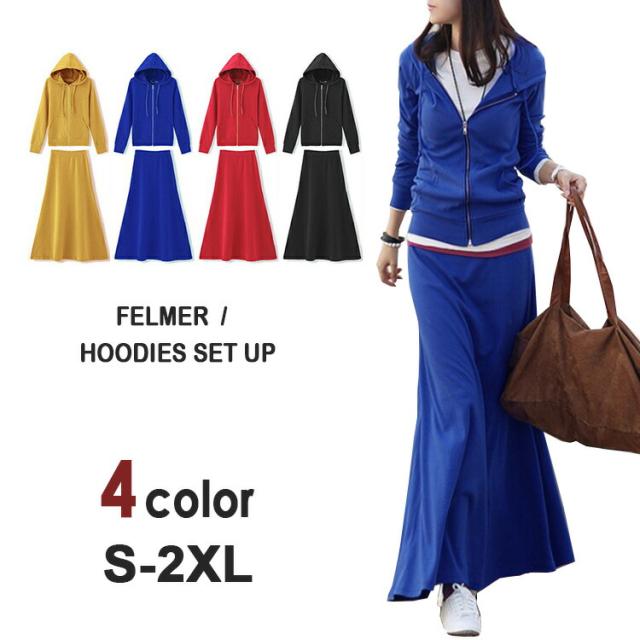 パーカー レディース マキシスカート セットアップ 長袖 秋冬 フード付き トレーナー トップス ボトムス 上下セット ジップアップ 部屋着 スウェット ジャージ ルームウェア スポーツウェア ロングスカート マキシ丈 おしゃれ かわいい 可愛い 無地