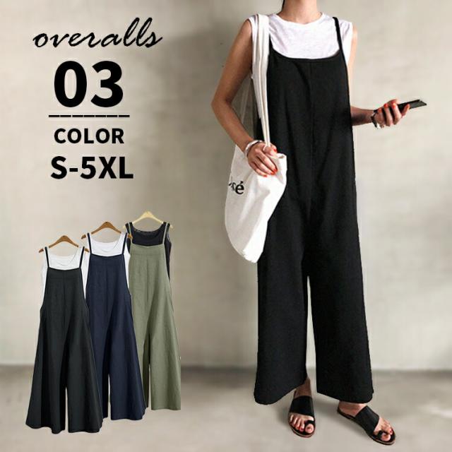 サロペット レディース 大きいサイズ ロング オーバーオール オールインワン 春夏 秋冬 ワイドパンツ キャミソール 綿 カジュアル 大人 可愛い おしゃれ ゆったり ナチュラル シンプル 無地 体型カバー マタニティ 20代 30代 40代 黒 ブルー グリーン