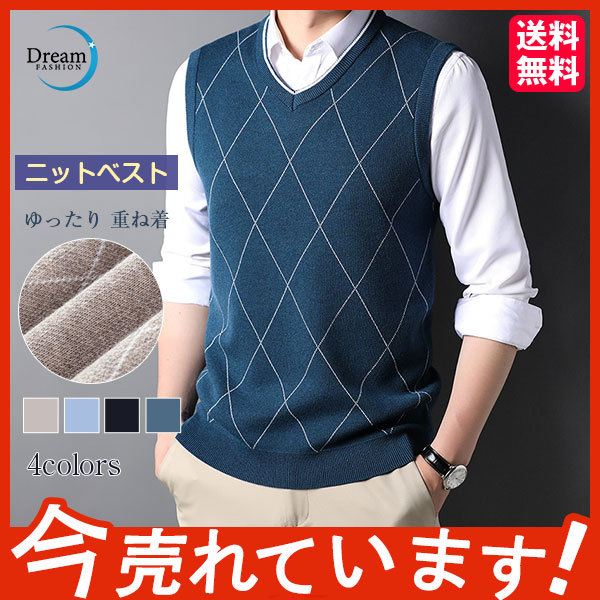 ニットベスト メンズ 秋 ジレベスト トップス プルオーバー ビジネス Vネック アーガイル柄 レイヤード 重ね着 コーデ 通勤 レイヤード シンプル