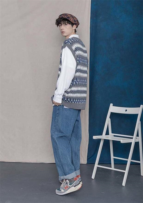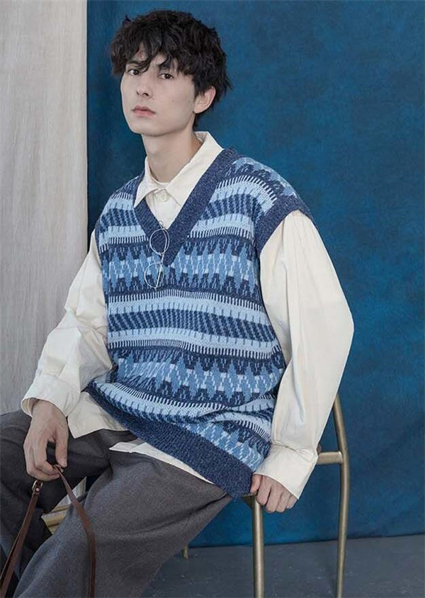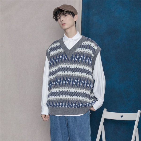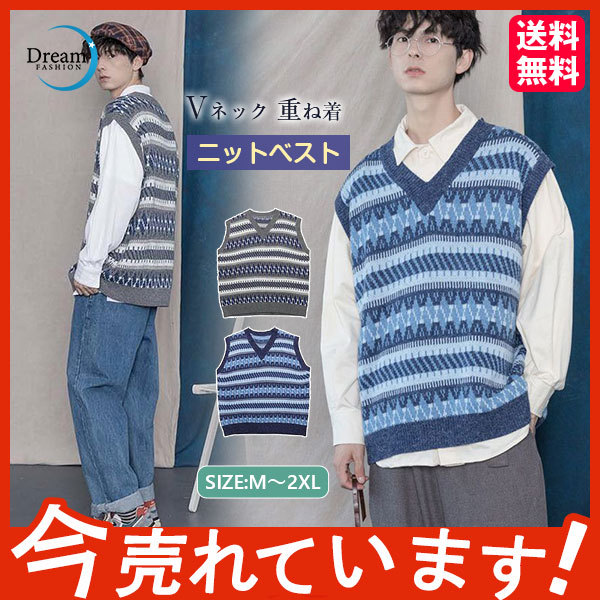 ニットベスト メンズ 春秋 チョッキ トップス アウター カレッジスタイル Vネック 重ね着 カジュアル ビッグシルエット コーデ ゆったり 保温 柄