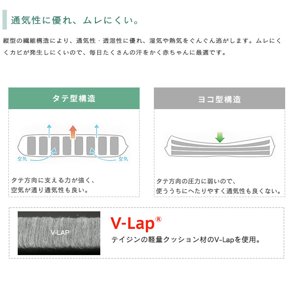 ◆中わたには、V-Lap®(縦型構造体)と、ファイバークッション®(積層加工素材)を