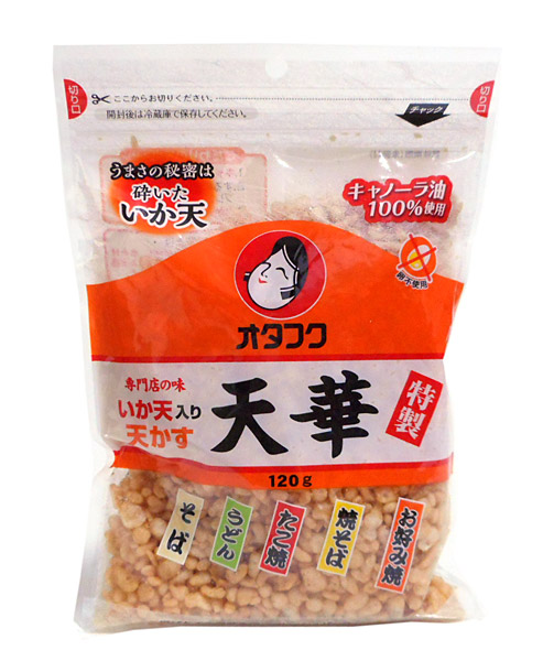 いか天、いか粉(するめ100%)入りでいかの風味が豊かな天かすです。