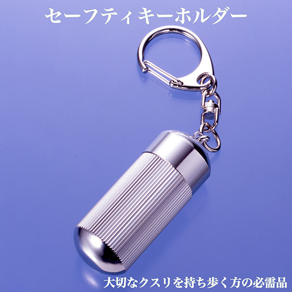 救急薬や常備薬を常時携帯する方のためのカプセル付キーホルダーです。薬をカプセルに入れ、キーホルダーとして身につけておくといざという時も安心です。ポリプロピレン製のカプセルでショックに強く、気密性も高く、湿気などによる薬の変質を防ぎます。