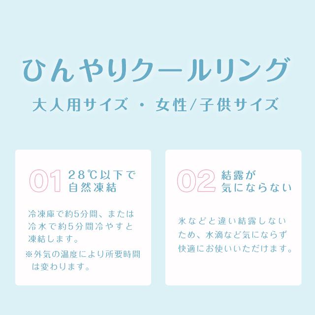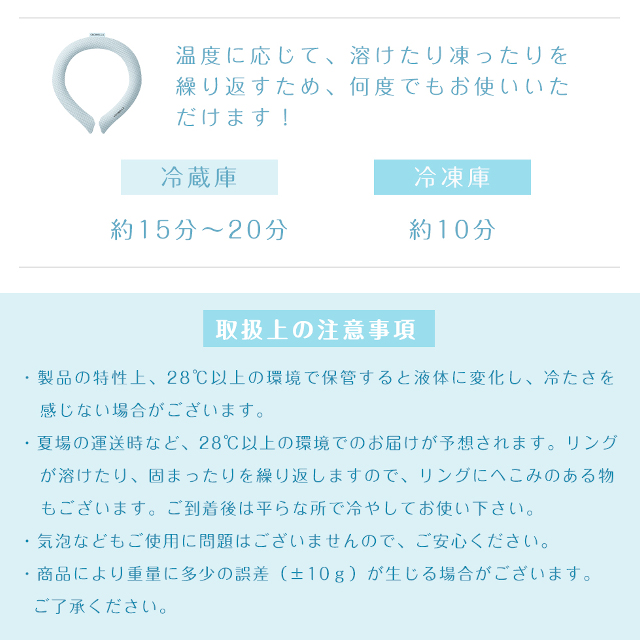 | 暑い真夏の季節でもリングはひんやりキープ! 28度以下の空間で凍る不思議な氷「PCM素材」で作られた首元用のネッククーラー。 心地良い温度で首の頸動脈を効率的に冷やすので熱中症対策にもオススメ! 氷のように冷えすぎないので低温障害の心配もなくお肌にもやさしい 一度溶けてもエアコンの効いた涼しい空間などに置いておくだけでも再び凍って繰り返し使える! 冷凍庫に入れたり水道水に浸けることでさらにスピーディに凍るので急なお出かけにも対応します。 首元にフィットして落ちにくいデザイン。 スポーツでアクティブに動く方や屋外で作業をする方、通勤・通学時、釣りをする方、家事をする方、ホットフラッシュが気になる方、クーラーのない空間での活動、お風呂上がりや気分転換など様々なシーンでお使いいただけます。 |
