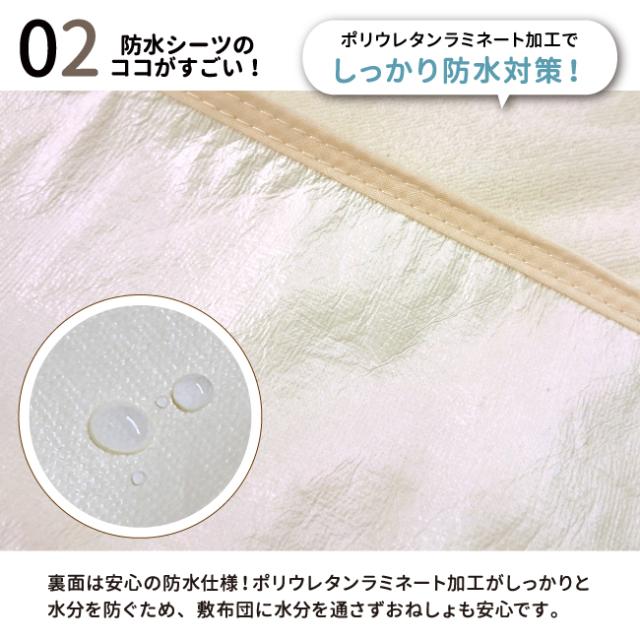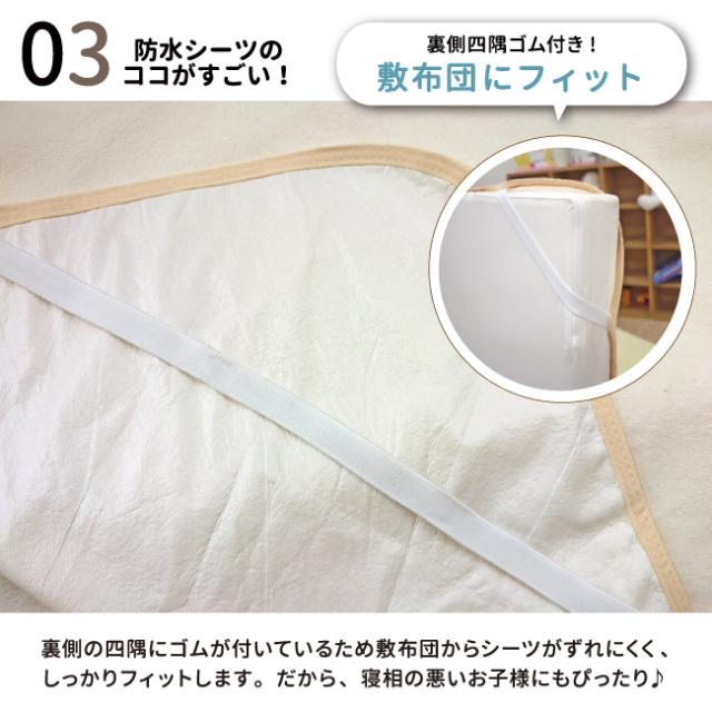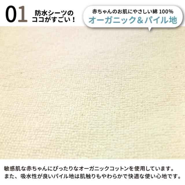 おねしょや吐き戻し対策に最適の防水シーツ。 表側はオーガニックコットン綿100%のパイル地。 裏側は防水加工された生地を使用しています。 裏側四隅にはゴムが付いていますので、敷布団にピッタリフィットしてずれにくいです。