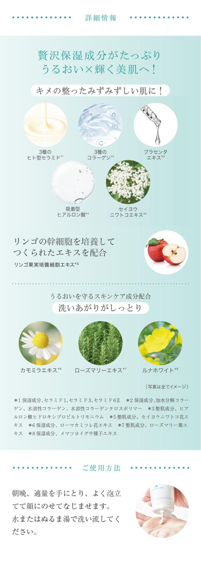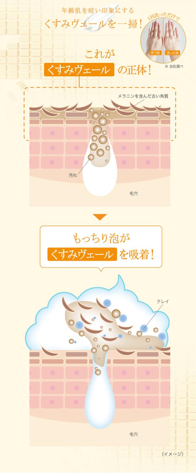 | 原材料名 | 水、グリセリン、ミリスチン酸、ステアリン酸、水酸化K、PEG-32、ベントナイト、ラウリン酸、ソルビトール、イソステアリン酸PEG-60グリセリル、ステアリン酸グリセリル、タナクラクレイ、モロッコ溶岩クレイ、カオリン、流紋岩末、ヒアルロン酸ヒドロキシプロピルトリモニウム、リンゴ果実培養細胞エキス、セイヨウニワトコ花エキス、ローマカミツレ花エキス、ローズマリー葉エキス、メマツヨイグサ種子エキス、プラセンタエキス、水溶性コラーゲンクロスポリマー、加水分解コラーゲン、水溶性コラーゲン、セラミド1、セラミド3、セラミド6?、フィトスフィンゴシン、コレステロール、レシチン、コカミドプロピルベタイン、ココイルグリシンK、ココイルメチルタウリンNa、ラウロイルラクチレートNa、酸化チタン、BG、フェノキシエタノール、ポリクオタニウム-7、カルボマー、キサンタンガム |