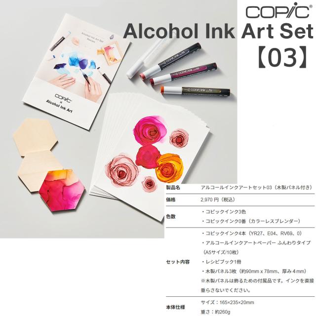 インクアートに必須の「コピックインク」「インクアートペーパー」に加えて、作品を貼り付けるための木製パネルが揃ったセットとなっています。
