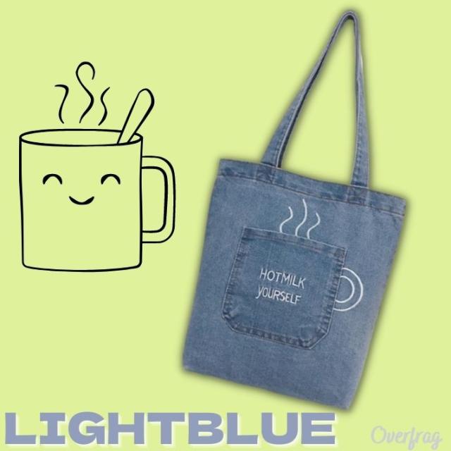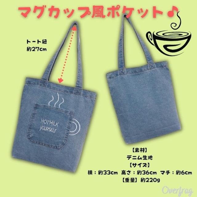 コーヒーカップ風のポケットがわかいい♪デニム生地で使いやすいカジュアルトートバッグです。