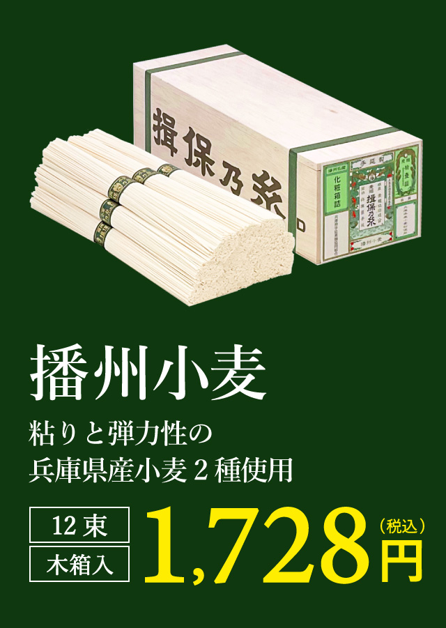 良質な小麦粉、揖保川の清流、そして赤穂の塩。播州が育てた素材を原料とし、600年間変わらない伝統の手延べ製法で作り上げた素麺、それが播州の特産品「揖保乃糸」です。揖保乃糸は、添加物を一切使用していません。そして、伝統の手延べ製法で「熟成」と「延ばし」を繰り返すことで、茹で伸びしにくく滑らかな舌触りと、コシがある歯切れのよい食感が生まれます。