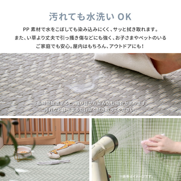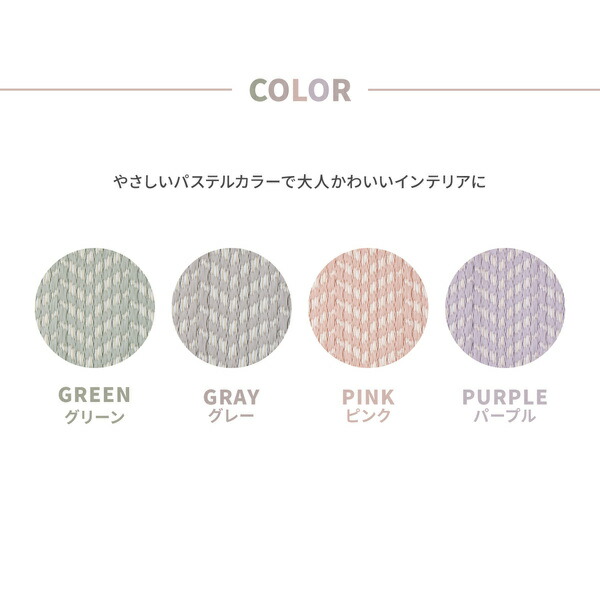 パステルカラーがかわいい、水洗い出来るPP素材のい草風カーペット。パイプの表面に筋が入っている筋入りパイプで、肌に密着しないからベタベタしにくく、汗ばむ季節にもおすすめ。また、パイプ内の空気層の保温効果で床からの冷気を防ぐため、寒い季節でもあたたかく過ごせます。