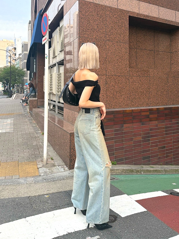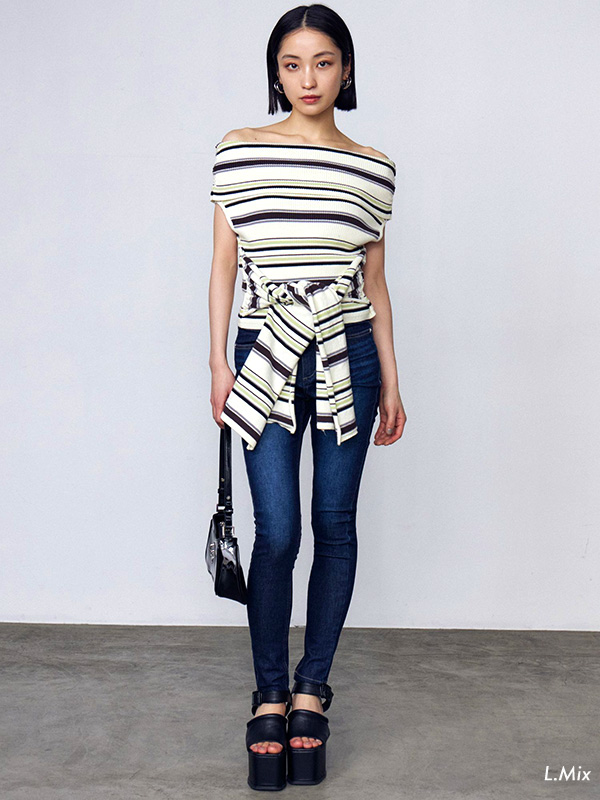 EMODA Ribbon off-the shoulder top エモダ リボン オフショルダー トップ 【EMODA(エモダ)】 「MODE=トレンドの発信」を軸に、スタイリング・素材・形で常に新しい提案を組み込み、 女性の「オシャレを楽しみたい」という気持ちに答えられるハイセンスでもありリアルクローズでもあるブランド、それがEMODA。 白黒の世界観に色・柄・異素材を組み合わせ、強さの中にも女らしさのあるスタイリングを提案していく。 FASHIONの枠を超えMUSIC・ART・CULTUREと結びつきながら新たなFASHIONの形を表現していく。 ウエストのタイデザインが目を引くリブニットトップス! オフショル風のネック広めデザインでデコルテを綺麗に見せてくれる一枚。 ウエスト結び部分は自身で調整が出来るのでお好みで調整可能。 リブニットなので伸縮性に優れ、体にフィットしやすいのが特徴です。 ボトムはワイドのデニムパンツで合わせるカジュアルなバランスがイチオシです。 | ||||||||||
