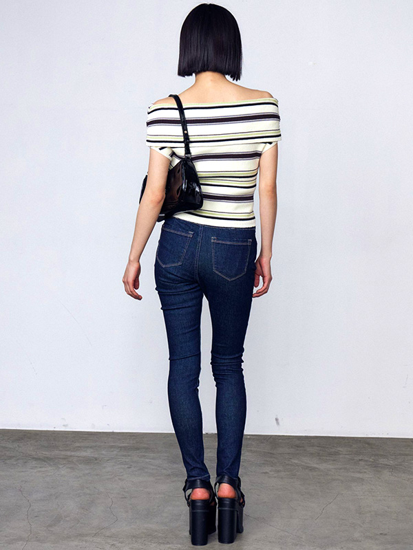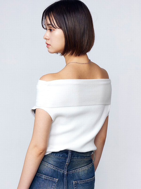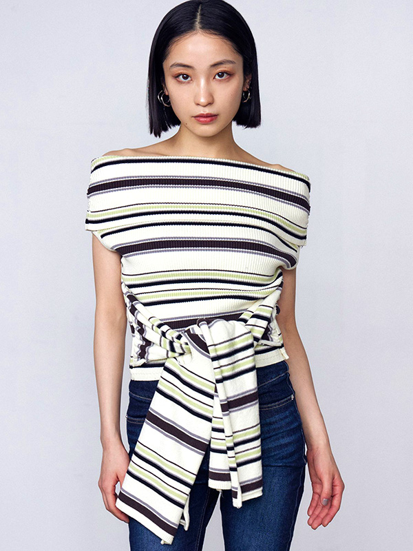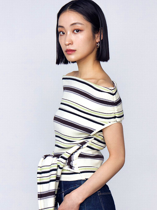 EMODA エモダ リボン オフショルダー トップ リブ ニット 半袖 オフショル風 薄い デコルテ おしゃれ かわいい シンプル 無地 ボーダー アイボリー 042532671501
