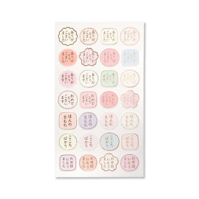 素材の和紙感、透け感を生かし温かく優しい気持ちが伝わるような柔らかい色彩のメッセージ付きシールです。