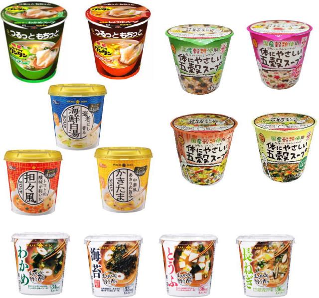 商品内容としては、ヒガシマル五穀スープを4種4個、明星食品つるっとわんたんを2種2個、ひかり味噌よりスープはるさめ3種3個、カップ味噌汁4種3個の12個セットでの販売となります。