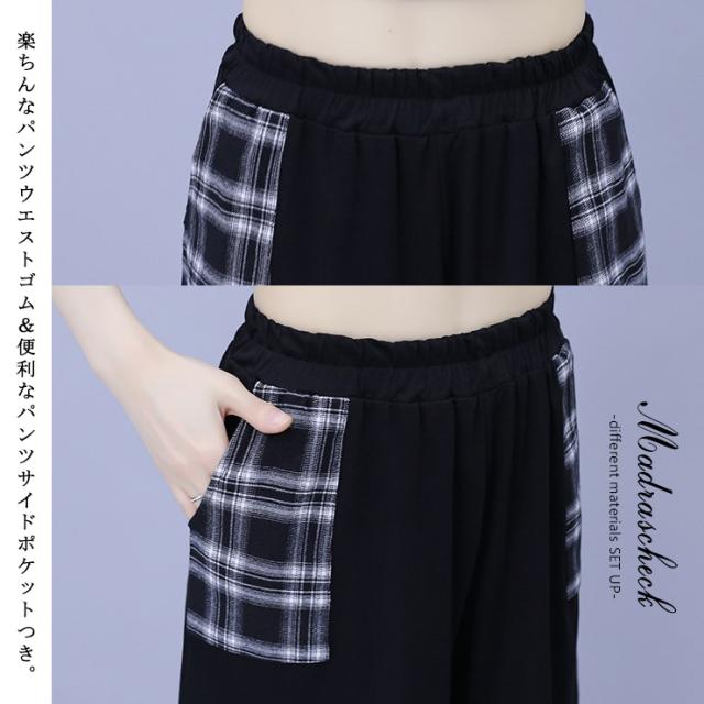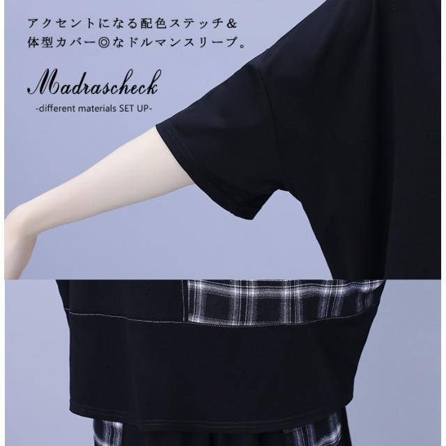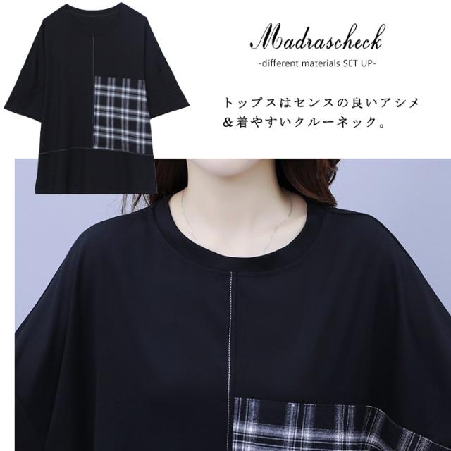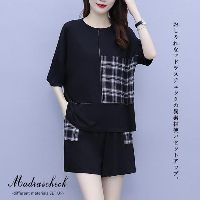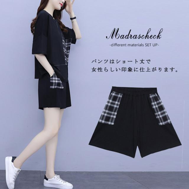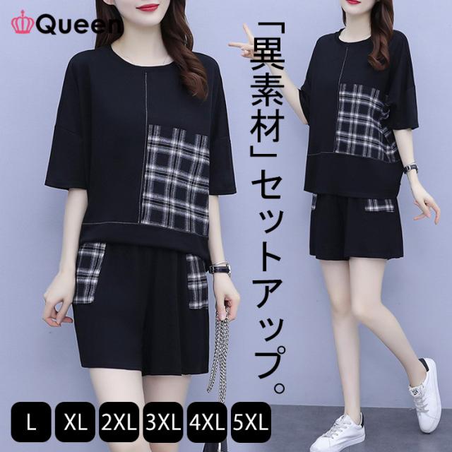 ★☆大きいサイズ レディース セットアップ ショートパンツ チェック柄 上下セット Tシャツ 夏 L LL 3L 4L 5L 6L ブラック 新入荷 メール便不可☆★