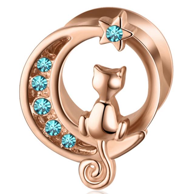 [2G 0G 00G 12mm ボディーピアス] ピンクゴールドキャットムーンフレア ボディピアス 2ゲージ 0ゲージ 00ゲージ 12.0mm 12ミリ メンズ レディース 猫 ねこ ネコ かわいい 可愛い アニマル 動物 プラグ 星 三日月 スター ムーン ジルコニア クリスタル アクアブルー 青色 人気