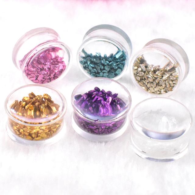 [0G 00G 12mm ボディーピアス]クラッシュメタルアクリルプラグ ボディピアス 0ゲージ 00ゲージ 12ミリ 12.0mm メンズ レディース 透明 クリア 金属アレルギー対応 ピンク グリーン シルバー ゴールド ホワイト パープル 金属片 おもしろい ユニーク 面白い 中身 揺れる 鉱物