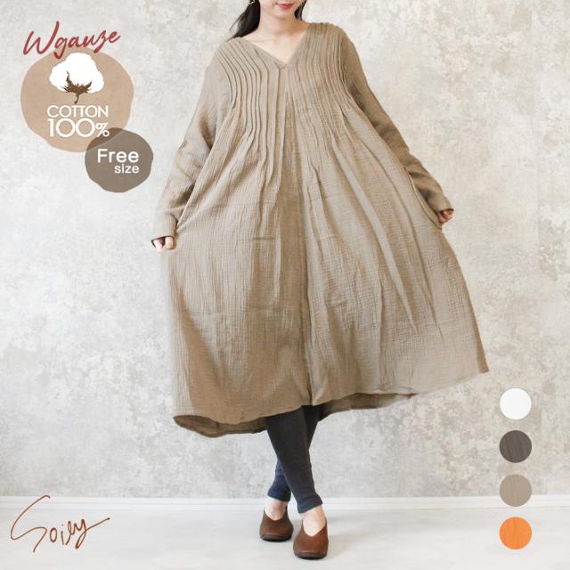 ワンピース ダブルガーゼ 綿100% レディース ワンピ 無地 長袖 Aライン 大きいサイズ コットン ロング丈 *00