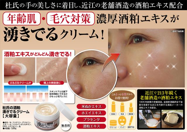 | 備考 | 1グラムあたり29.9円の高コスパ!大好評の酒粕エキスが湧き出る新感覚クリームを、たっぷり使える大容量サイズにした当社オリジナル品! 「杜氏の手」の美しさに着目し、近江の老舗酒造の酒粕エキス(保湿)を配合。 これ1つで6役だからおトクで便利!(化粧水、乳液、美容液、クリーム、パック、透明下地) |