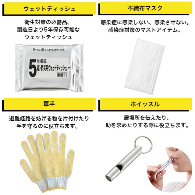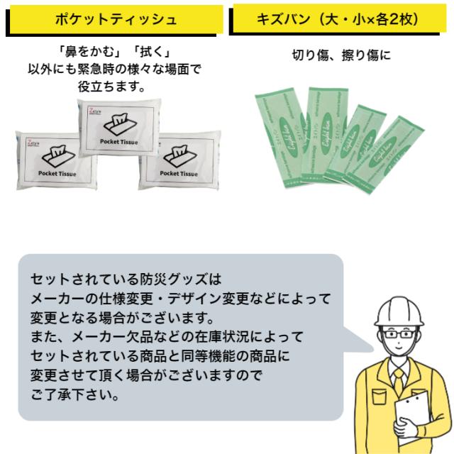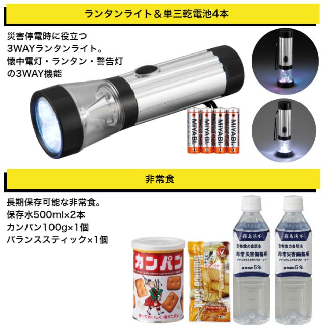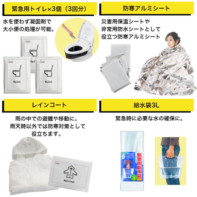 災害時にさっと持出せ、避難して一日目をしのぐのに役立つ一次持ち出し品をセット。