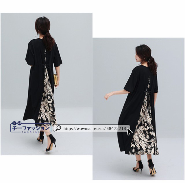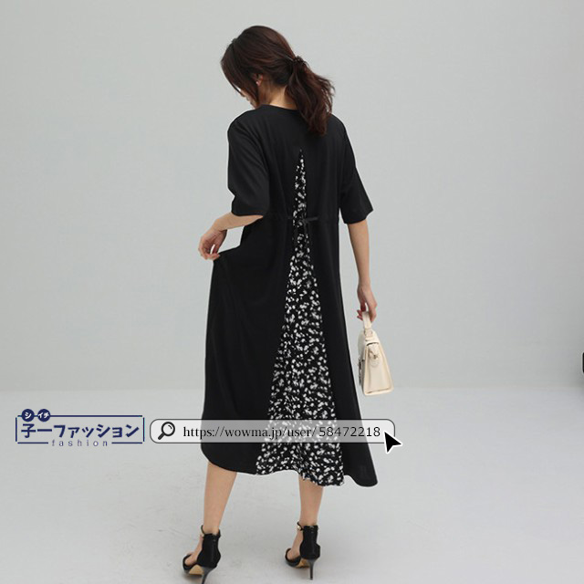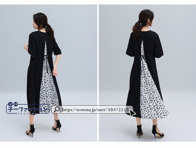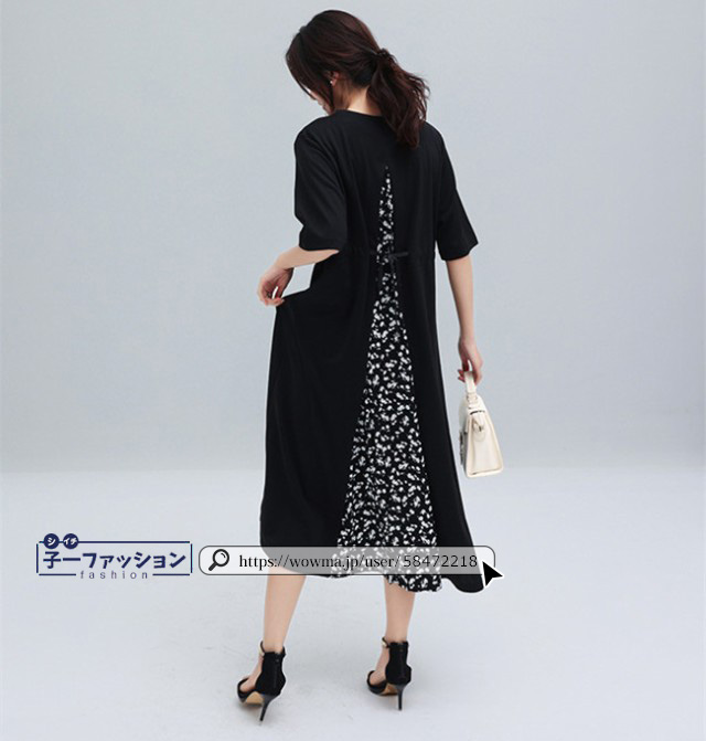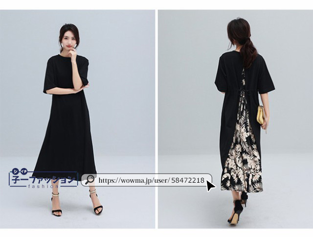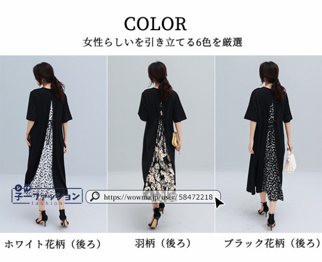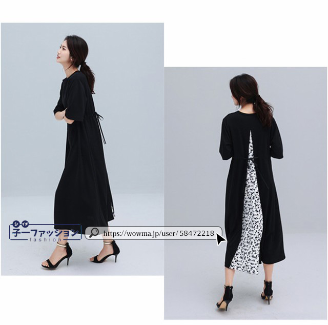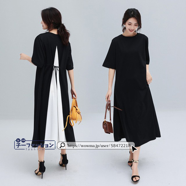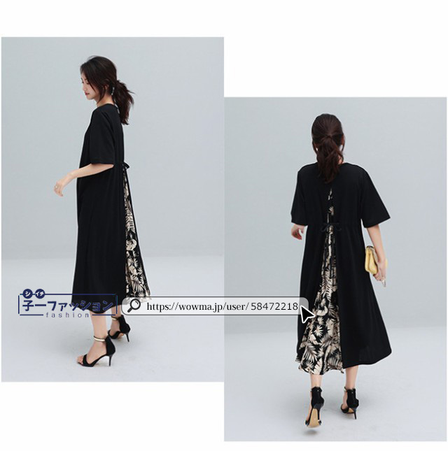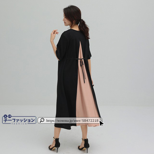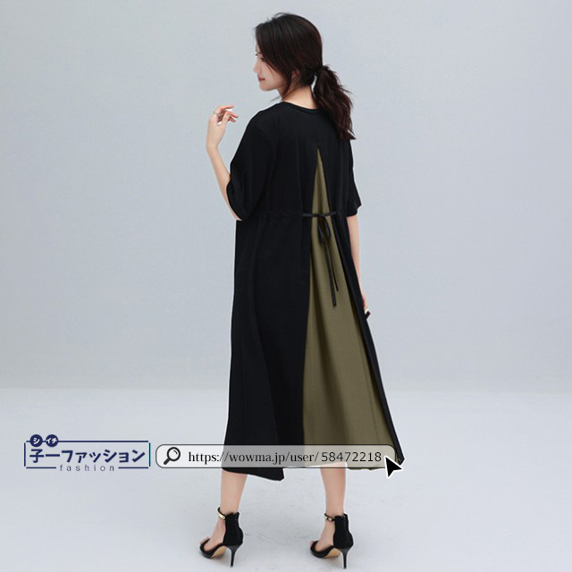 レイヤードワンピース マキシ丈ワンピース 冬新作 新作 異素材 ワンピ ロング丈 Tシャツワンピース レディース ラウンドネック 無地 カーキ ピンク ホワイト スリット入り 秋服 秋冬