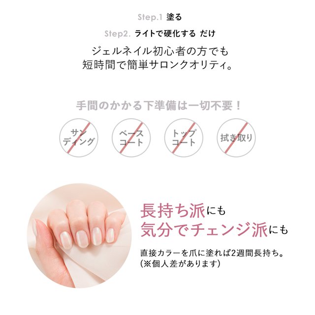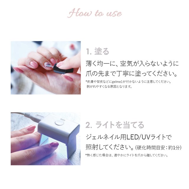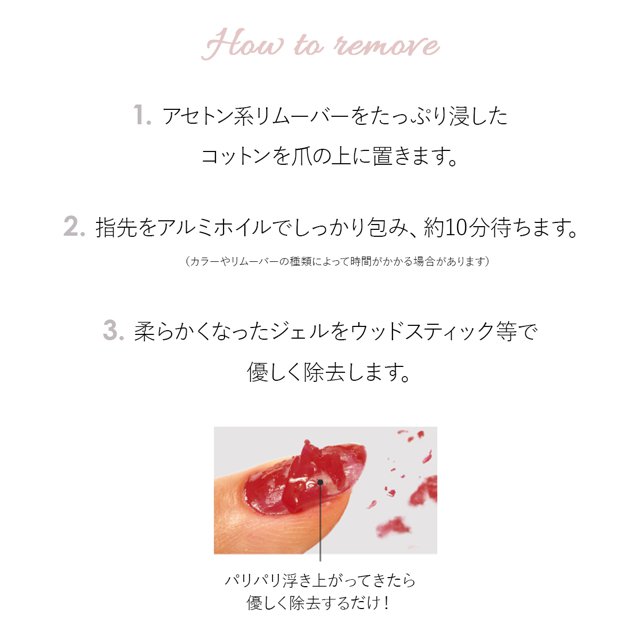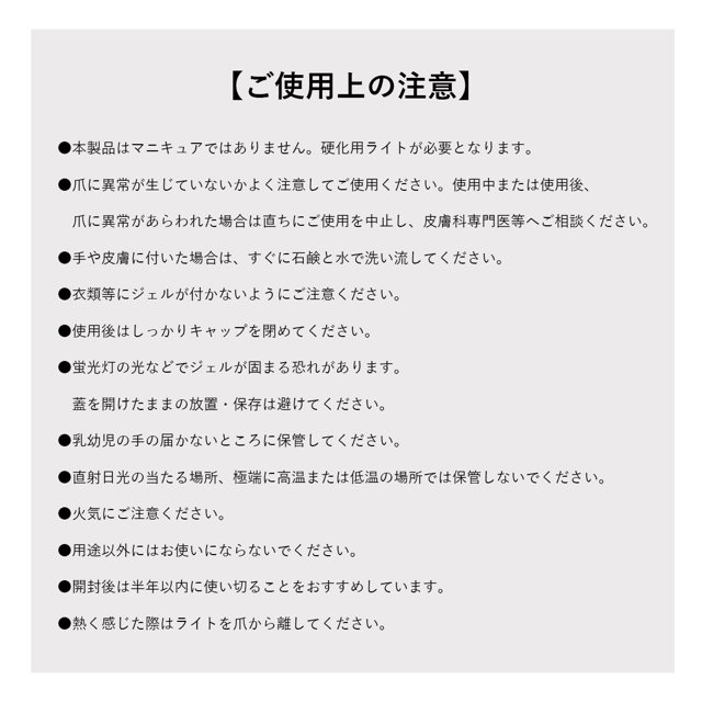 | 使用上の注意 | 蛍光灯の光などでジェルが固まること恐れがあります。蓋を開けたままの放置・保存は避けて下さい。 直射日光の当たる場所、極端に高温または低温の場所では保管しないで下さい。 開封後は半年以内に使い切ることをおすすめしています |