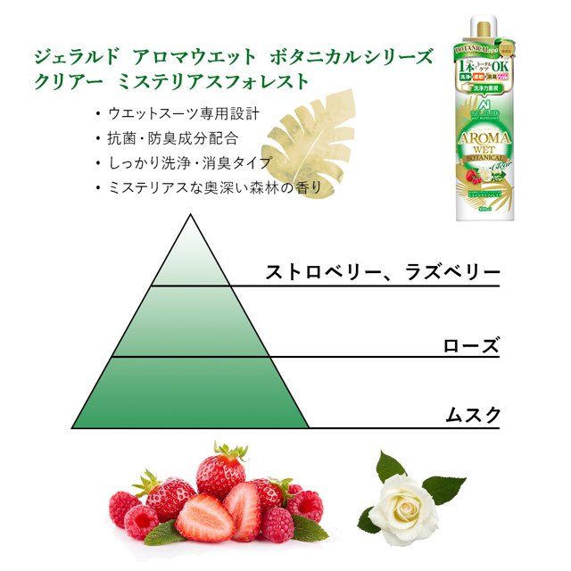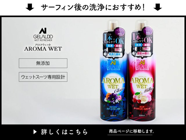 | 説明 | 従来の洗浄、柔軟効果に加え ワンランク上の上質な香りが楽しめます ボタニカルシリーズ 1回の洗浄でデリケートなウエットスーツを清潔に、しかも柔らかく仕上げる、従来のウエットシャンプーとは一線を画す洗浄剤です。サーフィン後シャワーを浴びるついでに、AROMAWETでウエットスーツのメンテナンスをしましょう。 大切なウエットスーツを清潔に保ち、長持ちさせる新習慣です。 ・洗浄力重視のクリアタイプ(ミステリアスフォレストの香り) ストロベーリやラズベリーのフルーティーなー香りや心やすまるほのかに甘いローズの香りが時間とともにぬくもりのあるムスクのかおりにかわり ほのかに続きます ・柔軟重視のミルキータイプ(ラグジュアリーアンバーの香り) みずみずしく香るレモンやライムの柑橘の香りやほんのり甘いピオニーやリリーの香りが時間とともに暖かみのあるホワイトアンバーの香りに変わり ほのかに続きます |