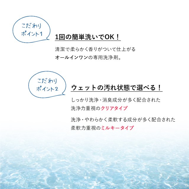 | 成分 | ミルキー 成分 / 界面活性剤( 8%、ジアルキルエチルヒドロキシエチルモニウムメトサルフェート,ポリオキシエチレンポリオキシプロピレンアルキルエーテル、ポリオキシエチレンアルキルエーテル)、エチレングリコール、塩化Ca、抗菌剤、金属封鎖剤、香料 クリア 成分 / 界面活性剤( 21%、ポリオキシエチレンアルキルエーテル、ジアルキルカチオン、アルキルジメチルアミンオキシド、ポリオキシエチレンソルビタン脂肪酸エステル)、植物エキス、安定化剤、再付着防止材、抗菌剤、pH調整材、香料 |