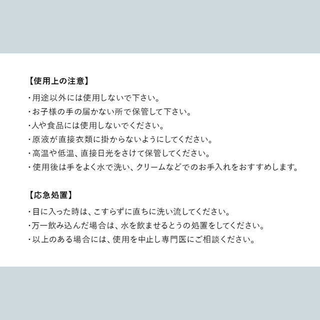 | 使用上の注意 | ・用途以外には使用しないで下さい。 ・お子様の手の届かない所で保管して下さい。 ・人や食品には使用しないでください。 ・原液が直接衣類に掛からないようにしてください。 ・高温や低温、直接日光をさけて保管してください。 ・使用後は手をよく水で洗い、クリームなどでのお手入れをおすすめします。 【応急処置】 ・目に入った時は、こすらずに直ちに洗い流してください。 ・万一飲み込んだ場合は、水を飲ませるとうの処置をしてください。 ・以上のある場合には、使用を中止し専門医にご相談ください。 |