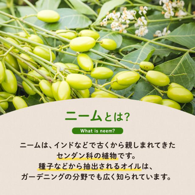 | 説明 | 天然100%のニームオイルとレモングラスの精油をブレンド。 レモングラス配合で香り爽やかに、害虫対策効果アップ。 ハーブ、野菜、花などを害虫から守りましょう。 水で2000倍~3000倍に希釈してお使いください。 濃度が濃すぎると、植物が変色する場合がありますので、しっかりと薄めてお使いください。 |