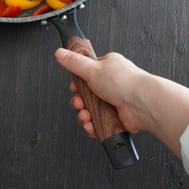 握りやすいシリコーンコーティングのハンドルです。木目調のプリントがとても素敵で料理中の気分があがります。また、引っ掛け穴があいているので、掛けて収納することができます。
