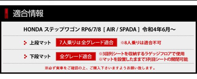 | 適合 | ホンダ ステップワゴン RP6 RP7 RP8 令和4年6月〜 ■上段用:7人乗りは全グレード適合 ※8人乗りは不適合 ■下段用:全グレード適合 ※3列シートを収納するラゲッジフロアで使用 ※マットを設置したままで3列目シートの開閉可能です。 |