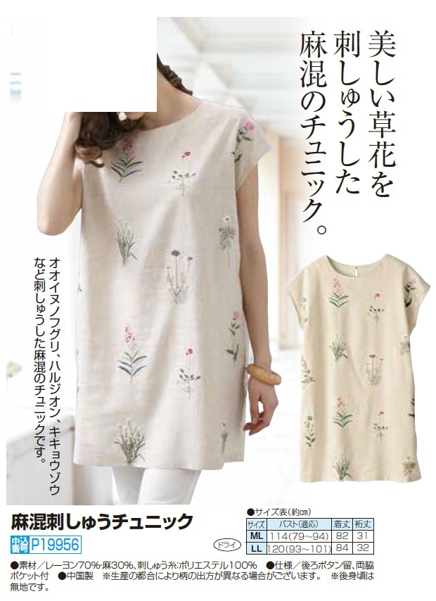 麻混 刺しゅうチュニック キナリ色系 ブラウス チュニック 花柄 ベージュ クルーネック ラウンドネック 半袖 レディース 婦人服 ミセス シニア 女性 ボタニカル 刺繍柄 オシャレ 体型カバー シニアファッション 50代 60代 70代 80代 母の日 お母さん 春夏 nss p19956