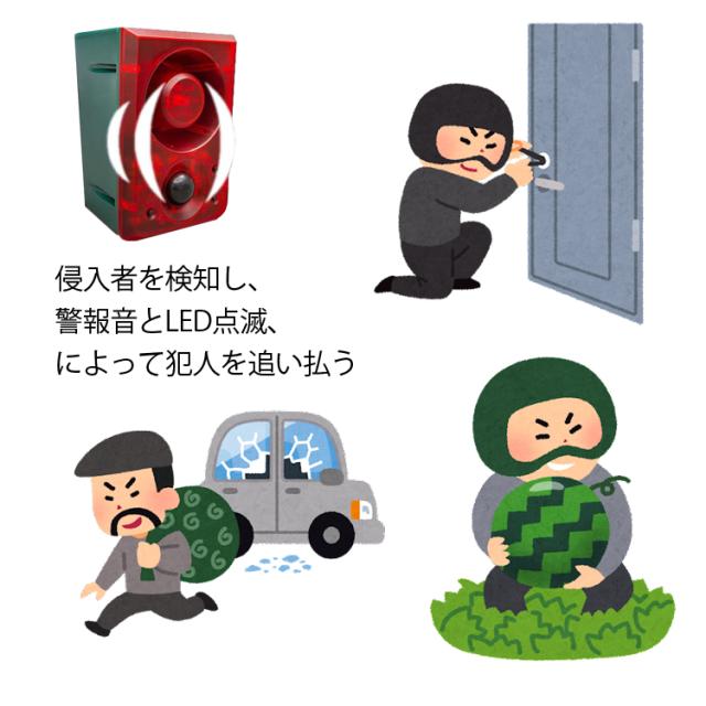 動きを感知してライトが点滅し、アラームが鳴ります。